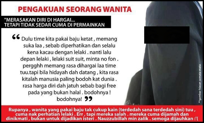 "Kentalkan sikit hati tu..kalau dapat kentalkan banyak lagi bagus. Baca dan kaji tentang cara hidup Para Sahabiah dan bagaimana pergaulan mereka dengan laki-laki ajnabi (jangan nak malas-malas). Apakah para muslimah yang pernah Nabi SAW tarbiyah suatu ketika dahulu bersikap sedemikian rupa (cuit sikit, dah tergedik-gedik..Ngorat sikit, dah sangkut..Ajak 'couple' sikit, terus setuju..Lepas tu, putus cinta, meleleh-leleh..Ada masalah sikit, doa nak mati..Kena marah dengan mak/ayah sikit, buat status cakap tak pernah bahagia..'Exam failed', kata taknak hidup lagi..'Pakwe' tak mesej sehari, dalam status penuh dengan kata-kata rindu..'Pakwe' marah sikit, buat status meleleh macam haram)?"